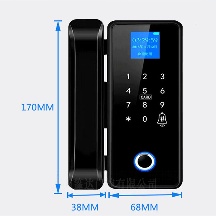 智能玻璃门指纹锁技术参数产品电源4节5号碱性电池(正常使用一年)容量200用户指纹读头半导体指纹头开锁方式指纹,密码,IC卡,APP,遥控器(选配)使用场所写字楼,商场,店铺等应急供电备有应急电源接口产品材质全金属制品低电量报警≤4.8V蓝博蓝博州